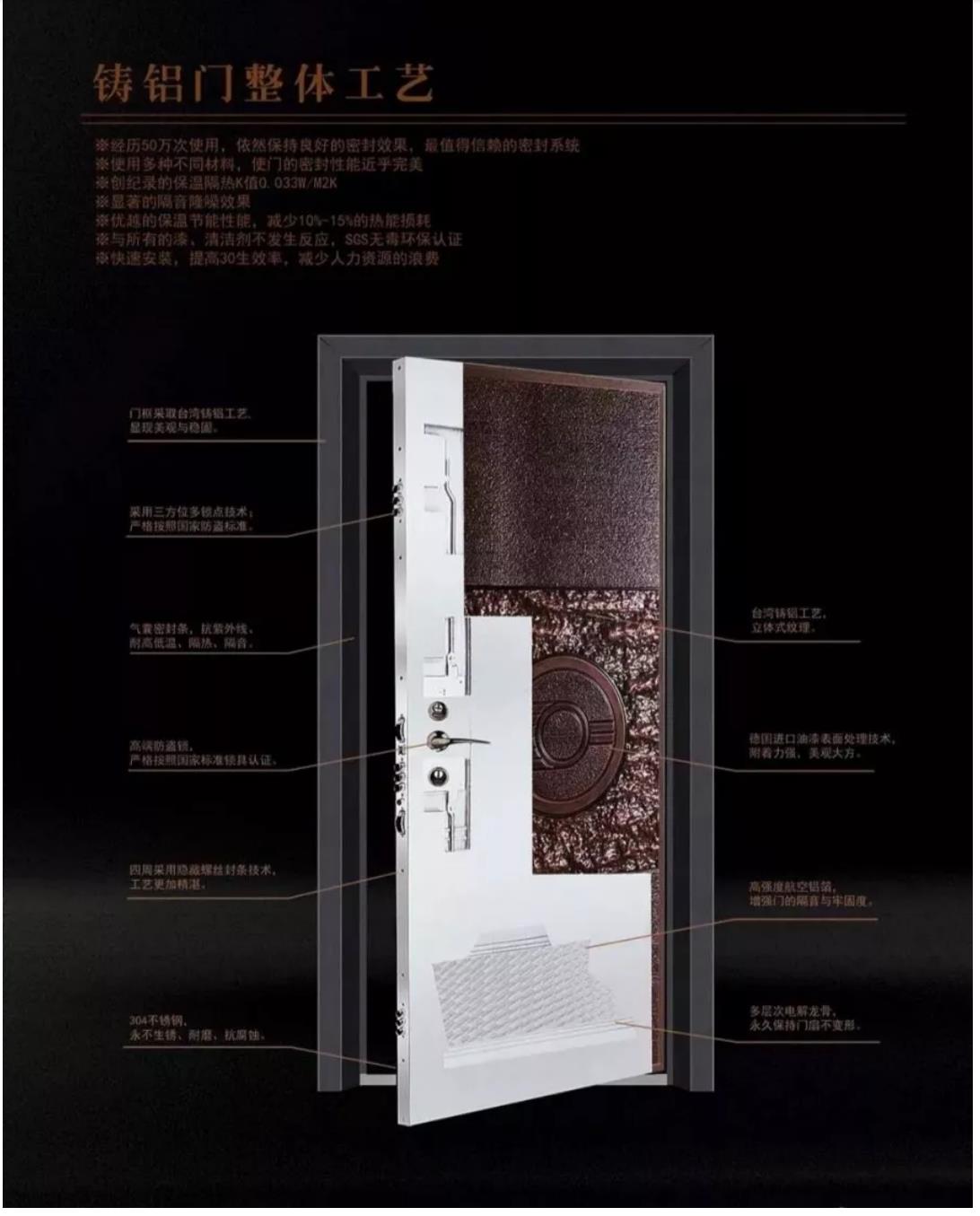 環(huán)保、抗腐蝕不生銹、高機械強度,整體鑄造而成,具有表面紋理細膩、致密度高、機械強度高等優(yōu)勢,整體強度大,其硬度可抵御強大拉力和強大沖擊力。它不易褪色、經(jīng)久耐用。鑄鋁門板因此具有了傳統(tǒng)門板所無法到達的防盜、防爆效果。
